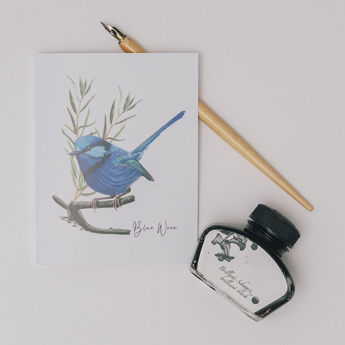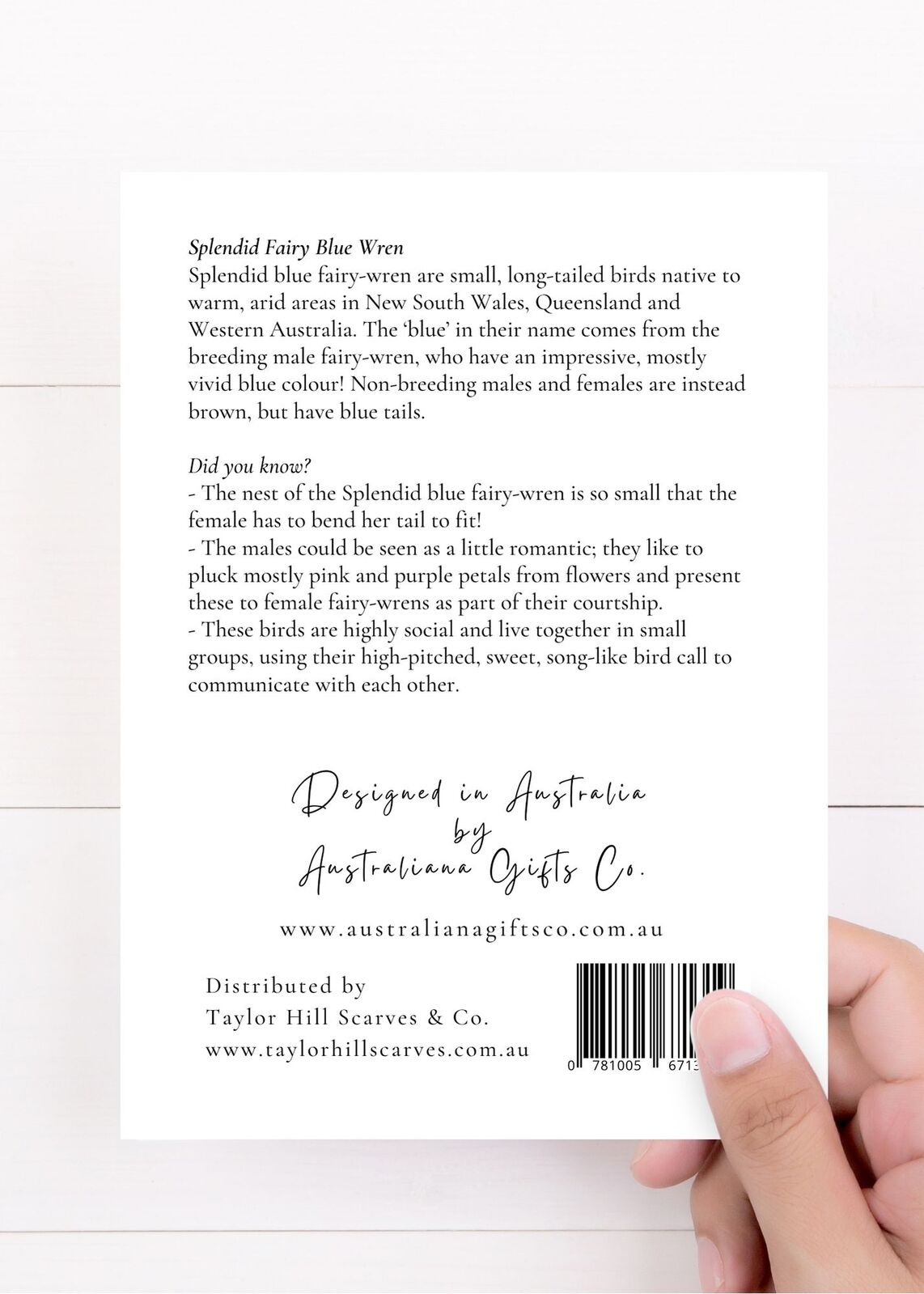 Our beautiful designed card features features a charming blue wren, calmly perching on the branch of a tree. The beautiful Australian songbird featured onthecard is the blue wren. Do you know that a male Blue Wren plucks flower petals for female birds as a romantic gesture? Our poster perfectly expresses the love and beauty of the Australian flora and fauna, which makes it a great Australian present to spoil your self or make it a perfect Australian gift for someone special. Our beautiful range of Native Australian Flora and Fauna cards are designed in Australia. This sweet Blue Wren bird will cheer up any receiver, the card comes with a sealable envelope. Add a matching scarf, bag, tea towel or poster that makes a great gift to any recipient. Check out the range.