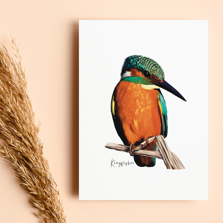 Our beautiful designed poster features the trendy water-diving bird, the Kingfisher! Do you know that Kingfishers are one romantic set of birds? When the male does affectionate court a female Kingfisher, he often takes her on a dinner treat of seafood. Yes, he offers her a fish gift from his hunting. Just as our Kingfisher card makes an excellent Australian card for friends and family or for visiting tourists, and why not keep one as a souvenir for you too! Our Kingfisher Bird card comes on a while background, this card can be easily framed for a table or wall art. This card will cheer up any receiver; it comes with a sealable envelope. Add a matching scarf, bag, tea towel or poster that makes a great gift to any recipient. This blank card is perfect to add with a gift for any occasion. For more beautifully illustrated cards, c heck out our entire range.