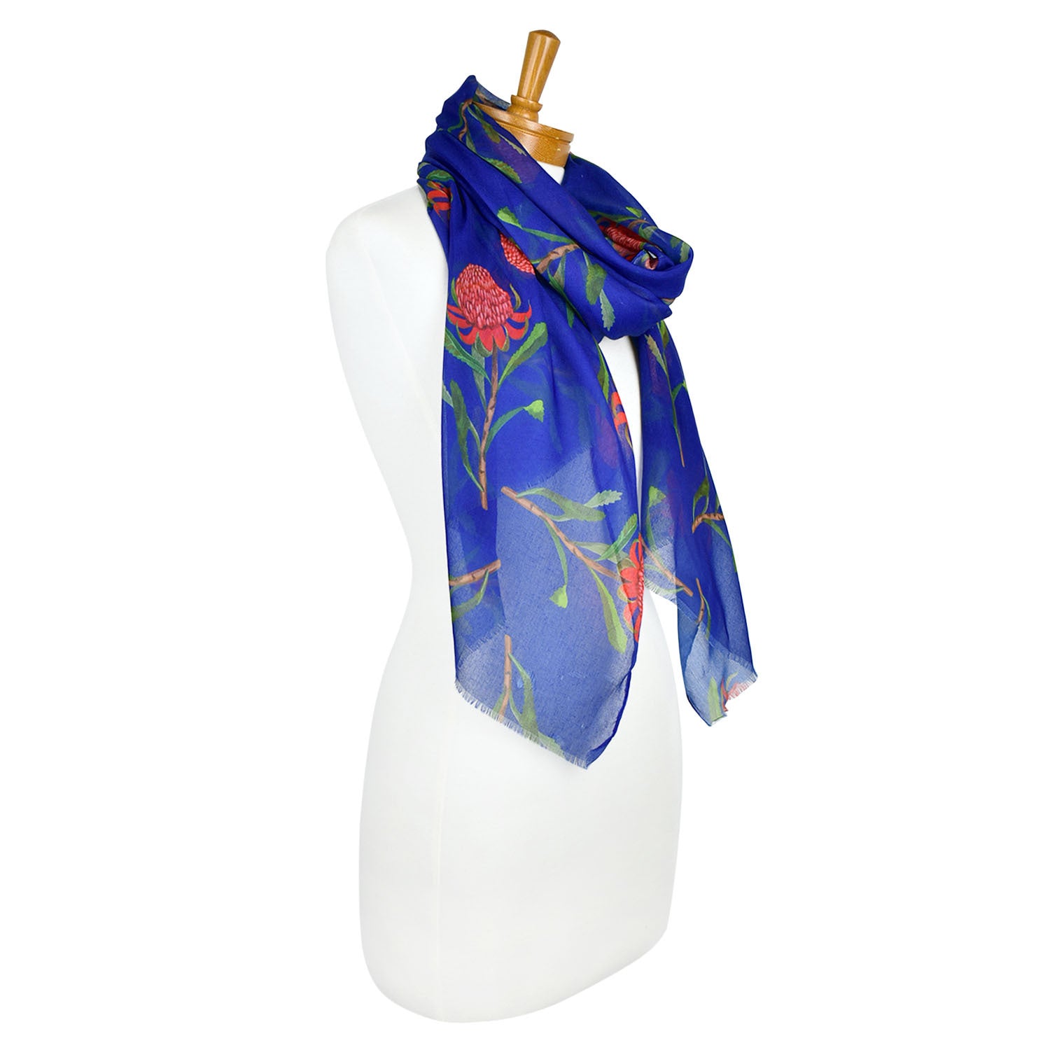 Our beautiful range of Native Australian Flora and Fauna cotton scarves are designed in Australia. This beautiful red pink tone Waratah flower is highlighted against a navy blue cotton scarf, which makes the floral print stands out and it compliments any outfit. This scarf comes in a specially designed* packaging for easy sending and it makes the perfect gift for that someone special. Check out our other design ranges. *It has information about the flower.