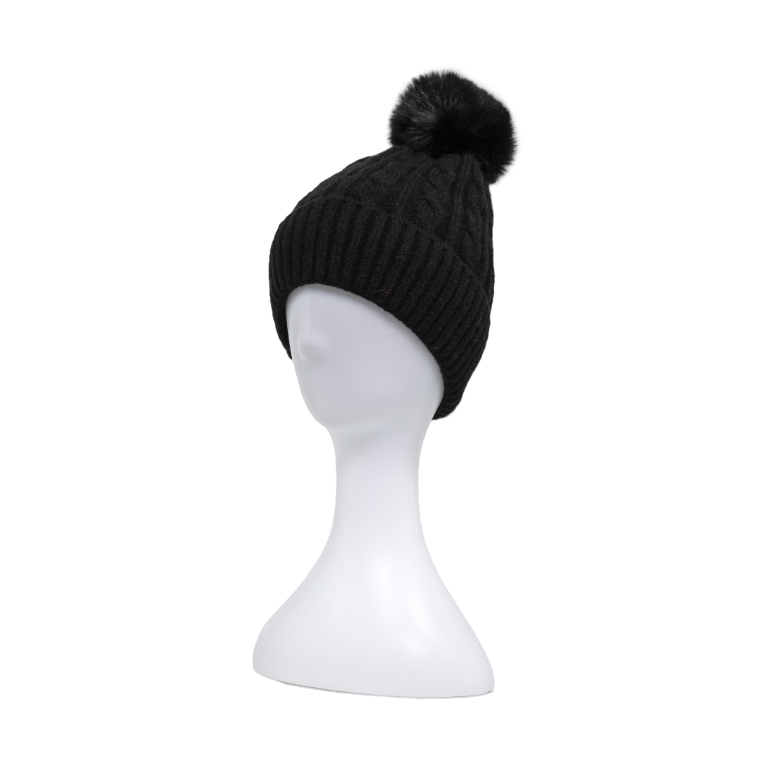 Cable Knit Pompom Beanie - Classic BlackStay effortlessly stylish with this double-layer cable knit pompom beanie in timeless black. Designed with a chic cable knit pattern and topped with a soft, fluffy pompom, this beanie delivers both superior warmth and modern elegance. The double-layer construction ensures extra insulation for chilly days, while the snug ribbed cuff offers a secure and cosy fit. Tailored with a feminine touch, this versatile winter essential pairs seamlessly with any outfitNwhether casual or dressed-upNmaking it a must-have accessory for the colder months.Material: 100% AcrylicMeasurement: 30 (H) x 21 (W) cm