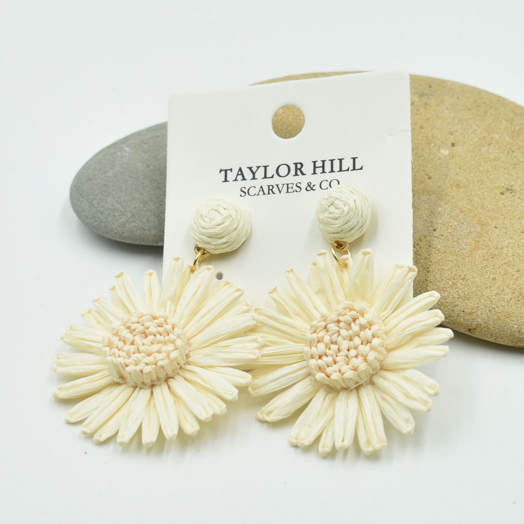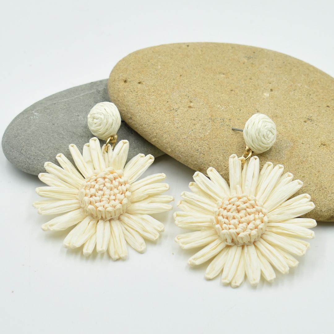 THSE1098: Milk White D Raffia Flower Earrings Soft, delicate, and effortlessly chic N the Milk White Raffia Flower Earrings are the embodiment of graceful elegance. Featuring a blooming floral design crafted from lightweight raffia in a creamy white tone, these drop earrings bring a gentle statement to your outfit. The subtle texture and neutral palette make them easy to pair with everyday looks or dressier ensembles. Designed with comfort in mind, the stainless steel stud backing ensures a secure fit all day. Whether youOre looking for a thoughtful gift for her, a sweet birthday surprise, or a lightweight earrings option to send overseas, this charming piece of fashion jewellery is sure to delight. Material: Paper + Stainless Steel Stud Measurement: 6.5cm High x 5cm Wide