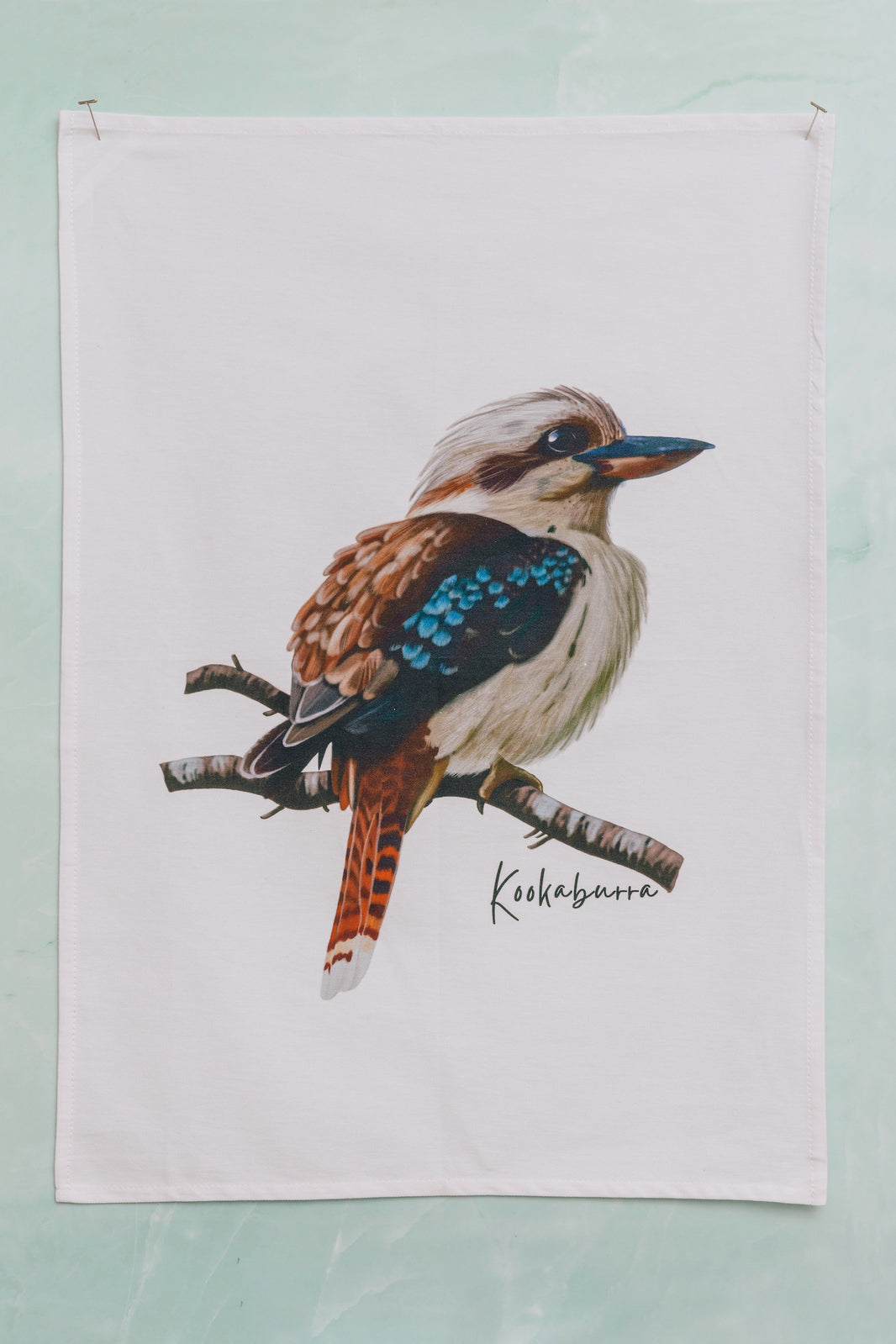 Our beautiful range of Native Australian Flora and Fauna cotton tea towel are designed in Australia. This beautiful Kookaburra is highlighted against this white cotton tea towel, which makes the floral print stands out and it compliments any kitchen. Get a few complimenting designs for your kitchen, make it an envy for visiting friends and family. This scarf comes in a specially designed* packaging for easy sending and it makes the perfect gift for that someone special. Check out our other design ranges. *It has information about the bird.