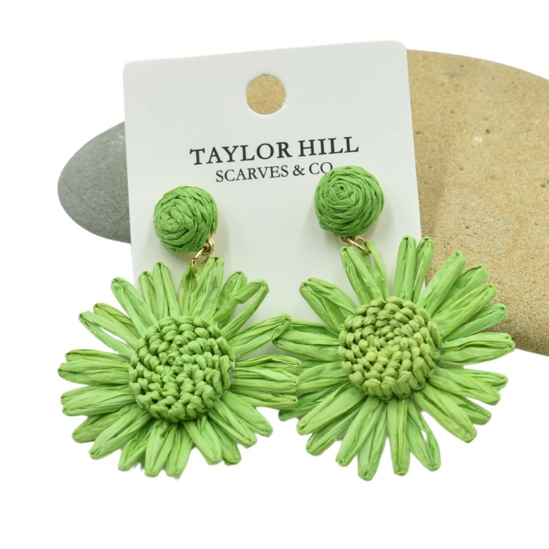 THSE1101: Emerald Green D Raffia Flower Earrings Make a striking impression with the Emerald Green Raffia Flower Earrings D a true statement accessory for the vibrant at heart. Designed in a delicate drop style, these lightweight earrings showcase a finely woven raffia flower in a rich emerald hue that exudes elegance and energy. The vivid green tones add a refreshing pop of colour, perfect for Spring Summer styling. Comfortable to wear with a stainless steel stud backing, they sit lightly and securely for effortless all-day wear. Whether youOre gifting for MotherOs Day, a birthday, or a thoughtful thank-you, these earrings are a memorable gift for her D and light enough to post across the globe. Material: Paper + Stainless Steel Stud Measurement: 6.5cm High x 5cm Wide