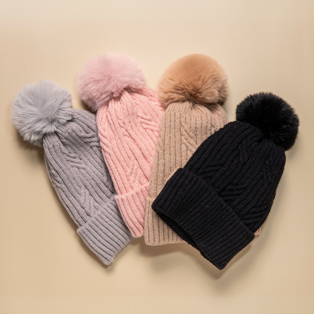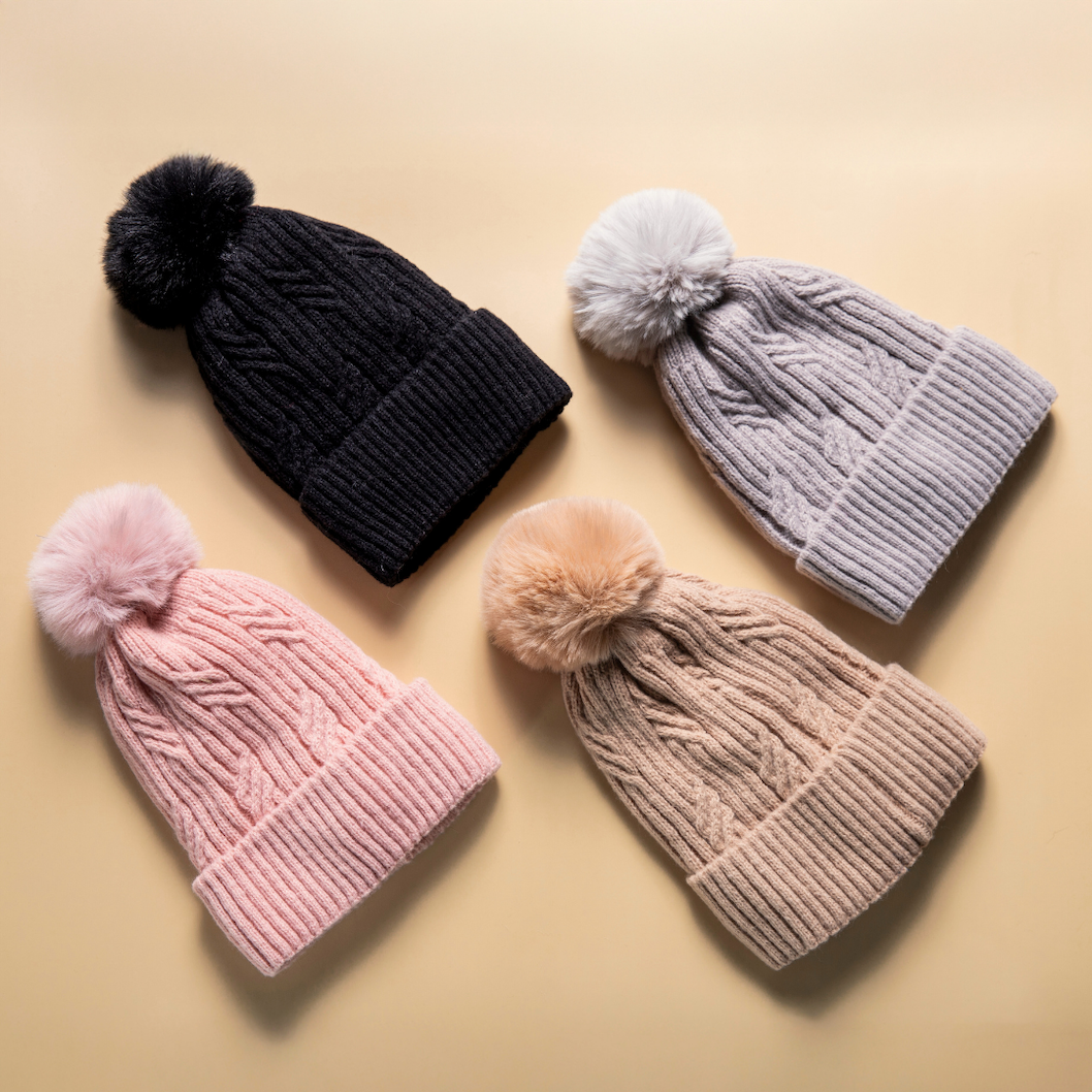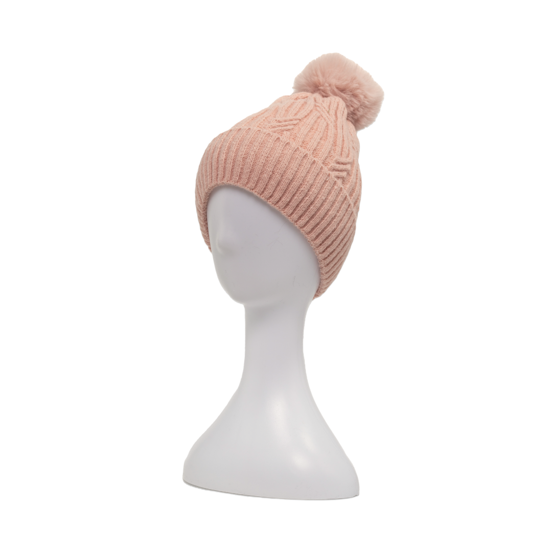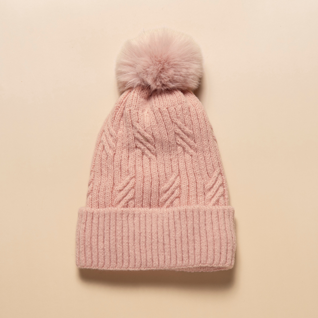 Braided Twist Pompom Beanie - Blush PinkStay cosy and chic with this double-layer braided twist pompom beanie in a soft blush pink hue. Featuring a stylish braided cable knit pattern with a soft, fluffy underlayer and pompom on the top, this beanie combines elegance, warmth, and all-day comfort. The double-layer design provides superior insulation, while the snug ribbed cuff ensures a secure, cosy fit. Tailored with a feminine design, this charming accessory adds a polished touch to any outfit, making it a perfect cold-weather essential or a thoughtful seasonal gift.Material: 100% PolyesterMeasurement: 28 (H) x 17 (W) cm