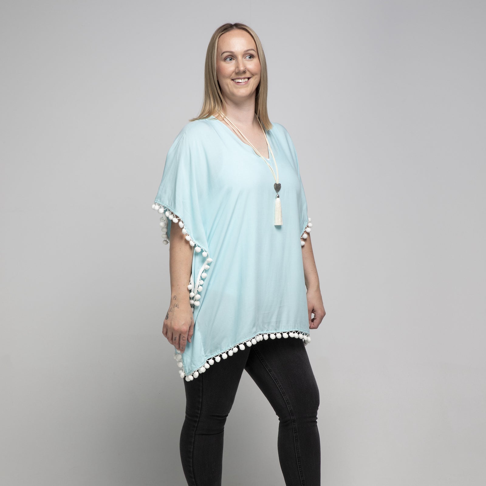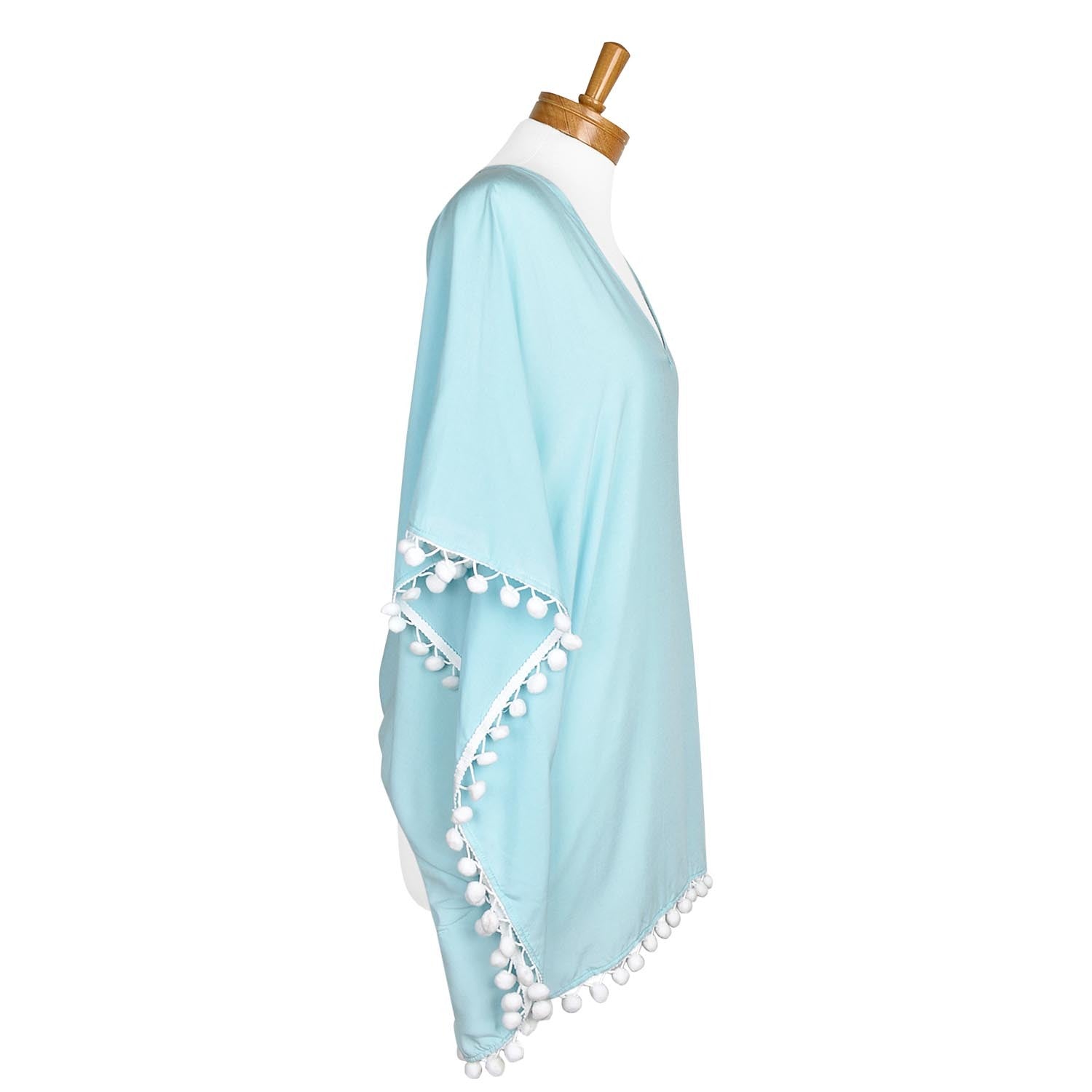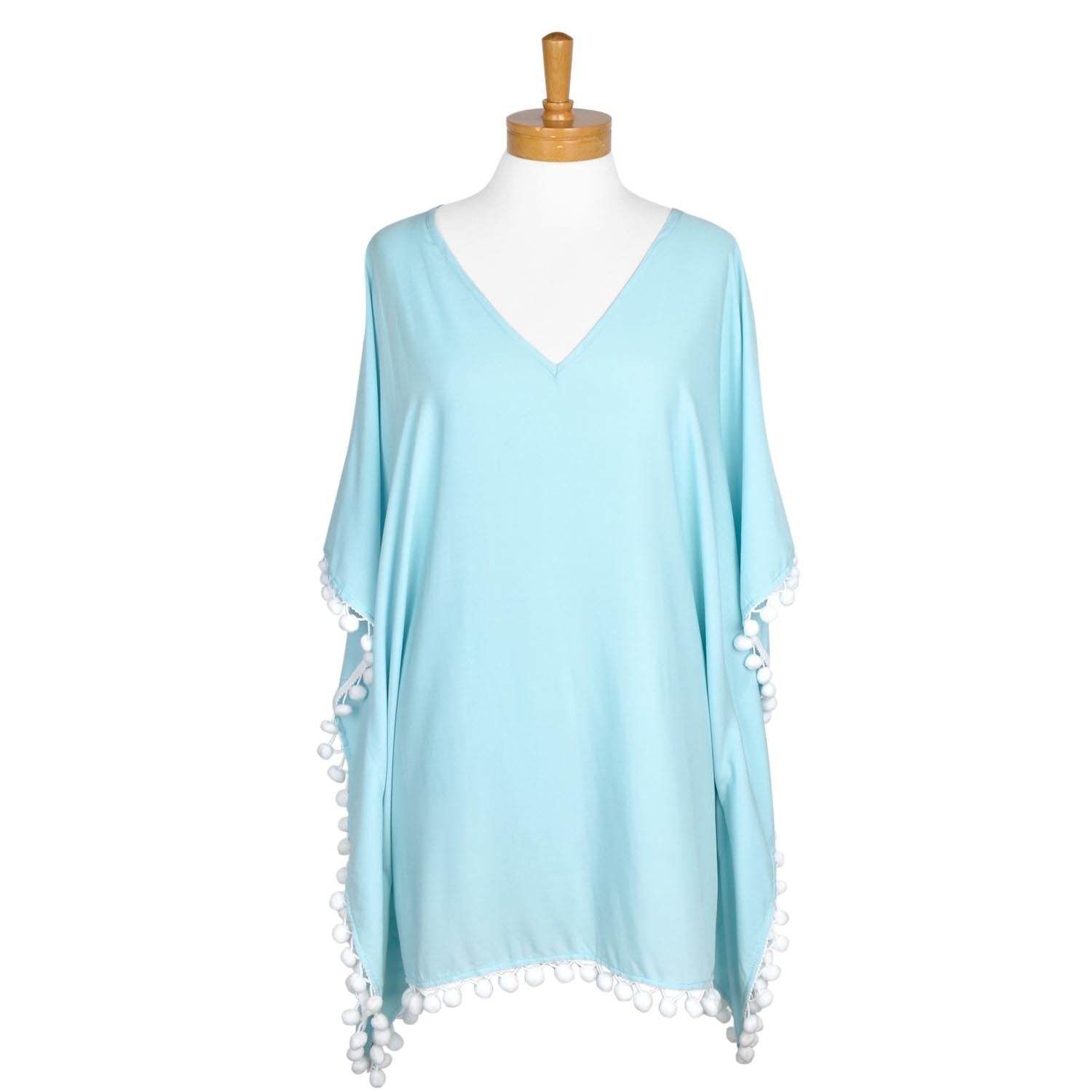 Kaftan is what summer is all about, something light, stylish and beautiful. Wear this one size fits most elegant plain baby blue cotton viscose blend kaftan with navy pom pom to the beach, wear a camisole underneath, wear it as a dress, or wear it with summer pants. However, way you wear it, it is absolutely comfortable and versatile.