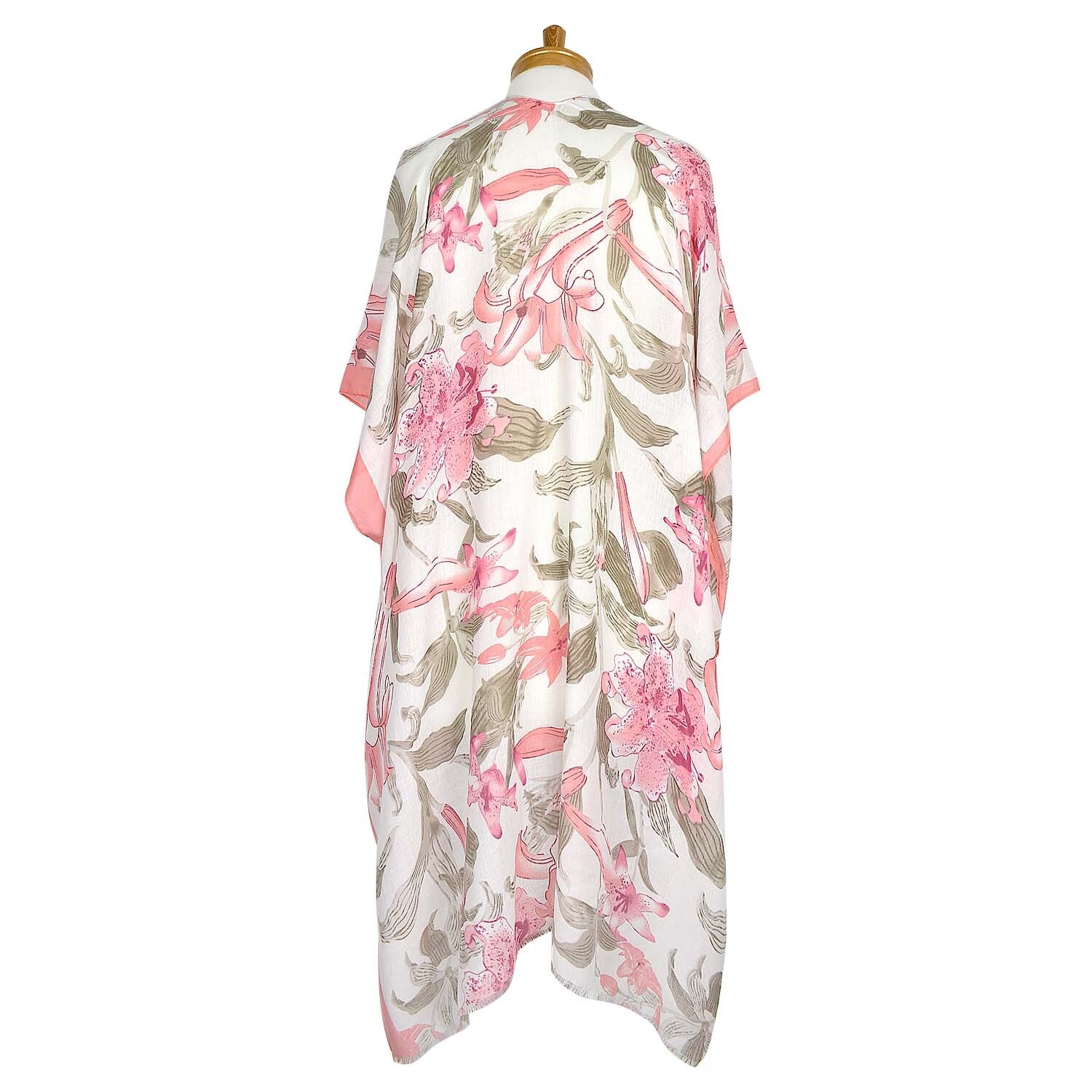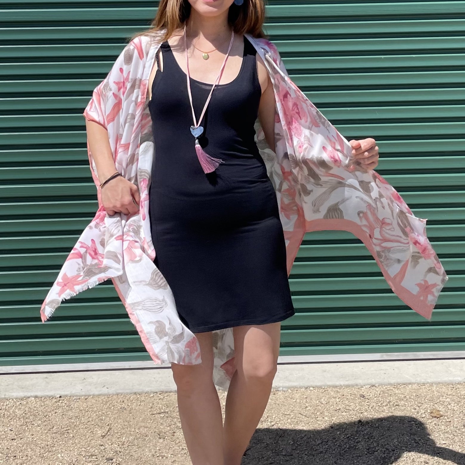 This cotton viscose blend kimono jacket is light, stylish and beautiful. Wear this one size fits most elegant white base with beautiful pink floral print from the beach to the bar. This elegant cotton blend kimono jacket is a must as part of your spring summer outfit; it is versatile, lightweight and is a good cover up for the harsh Australia sun. This kimono jacket has a soft feel; it is loose and airy for those hot summer days.