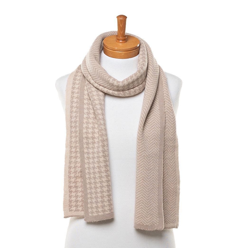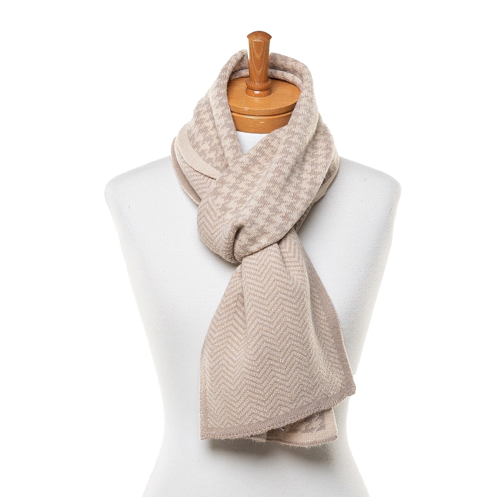 Beautiful soft Camel and Beige cotton acrylic blend scarf with a combination of Chevron and Houndstooth design, this scarf will surely compliment any outfit and keep you warm. This winter unisex scarf is classy and elegant, the soft texture of the scarf feel ever so soft againts the neck and it can double up as a wrap. A must have scarf to be kept in the bag for everyday use.