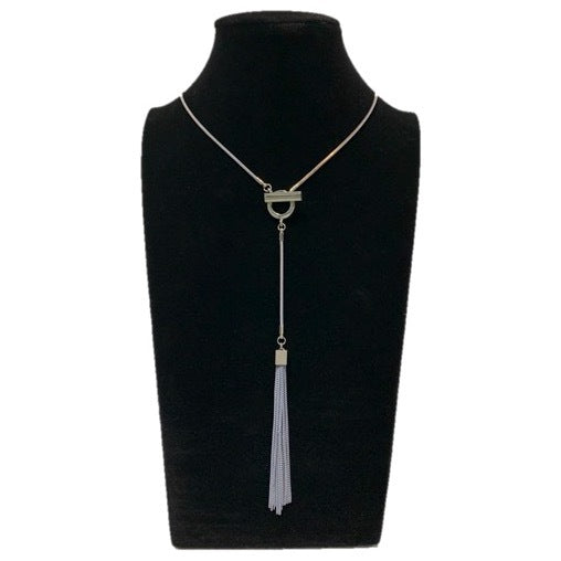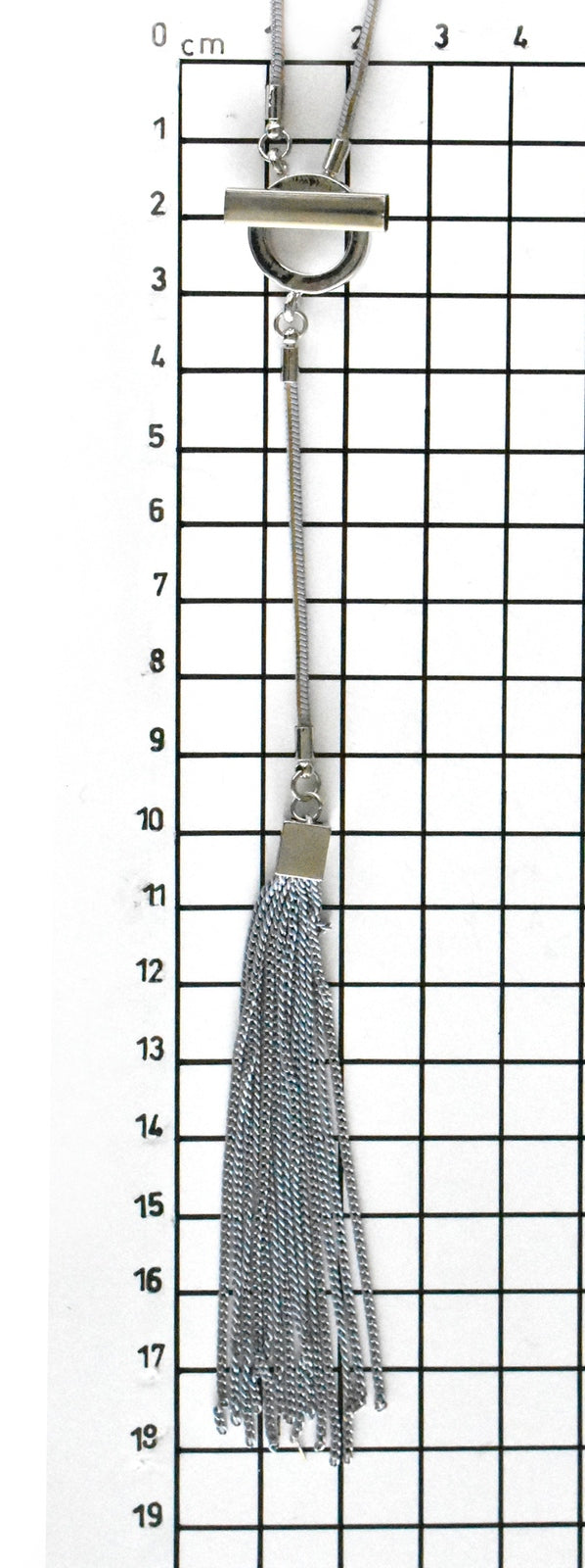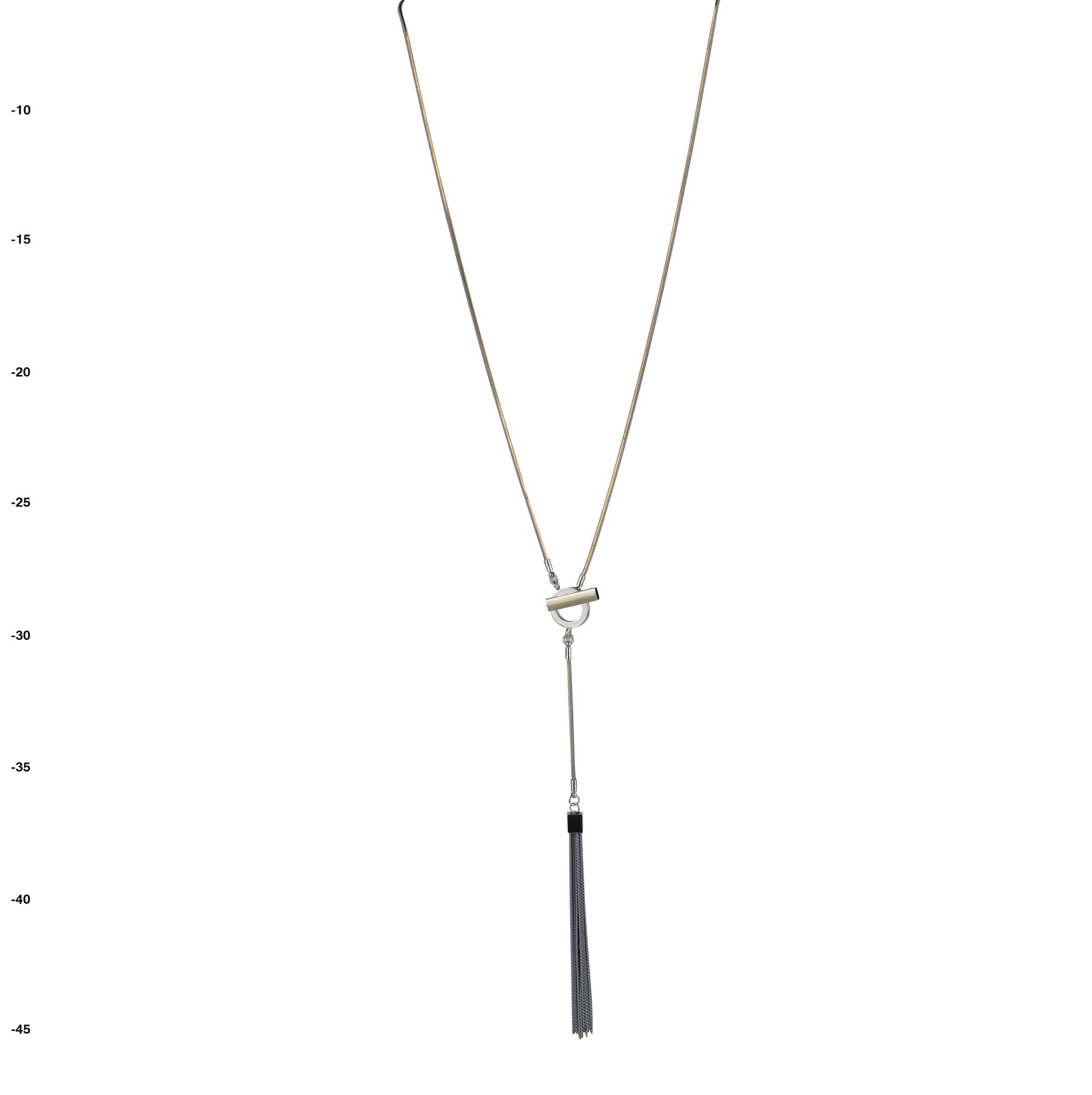 Silver Metal Bar inserted across Circle Charm with tassels on Grey with Gold septagon Necklace.