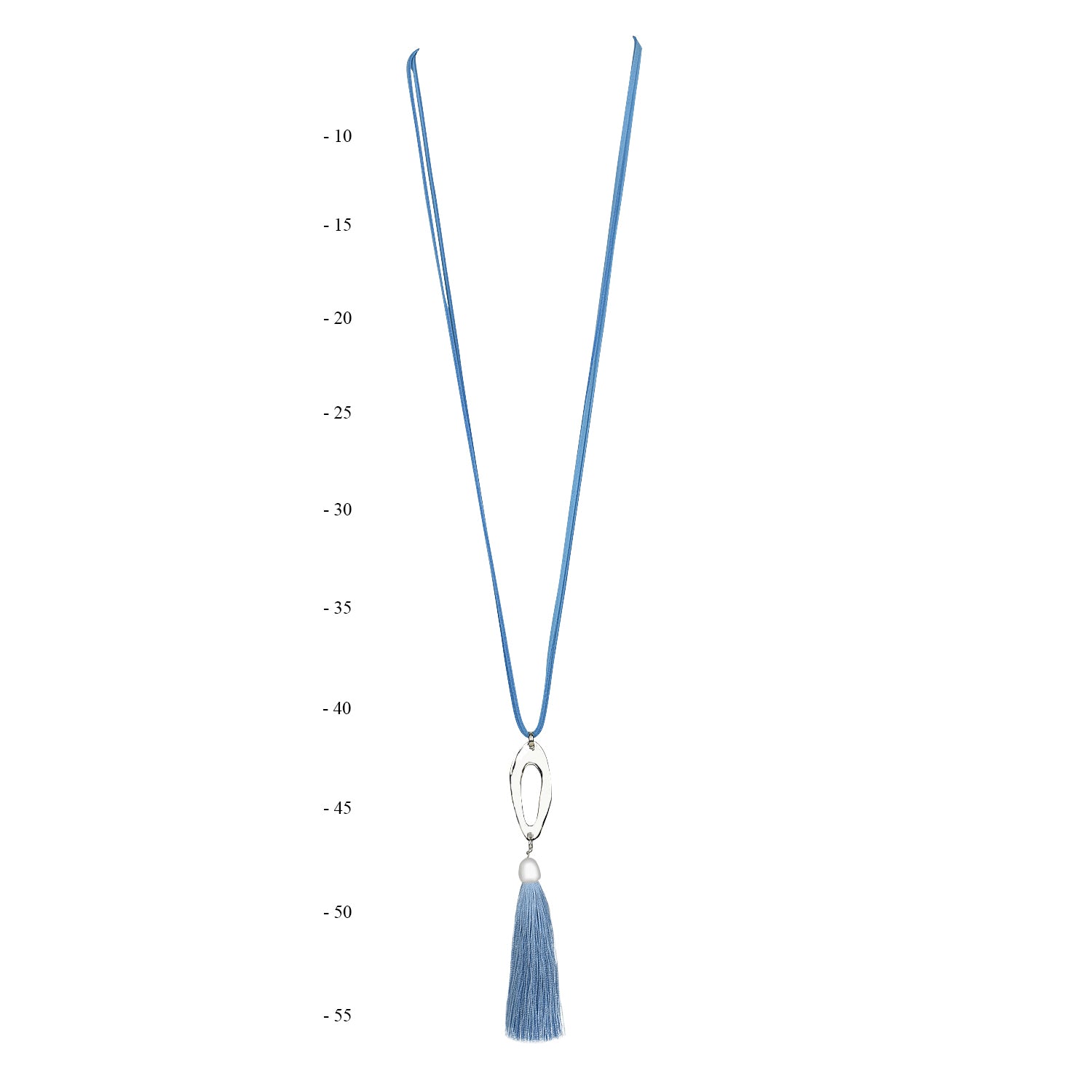Elegant shiny Silver Oval Frame Pendant, paired with French Blue Suede Leather necklace. The Pendant is decorated with Shiny Silky French Blue tassels. This necklace is fabulous way to dress up any outfit, by adding dimension and contrast. It is also a great way to create a versatile wardrobe when you travel without adding the extra luggage weight. Necklaces make great gift item. Pendant (Height-14.0 & Width- 2.0) Straight Length 57cm (Necklace & Pendant) Total Necklace (Length 84cm) Necklace Cord (Width 0.3cm) .