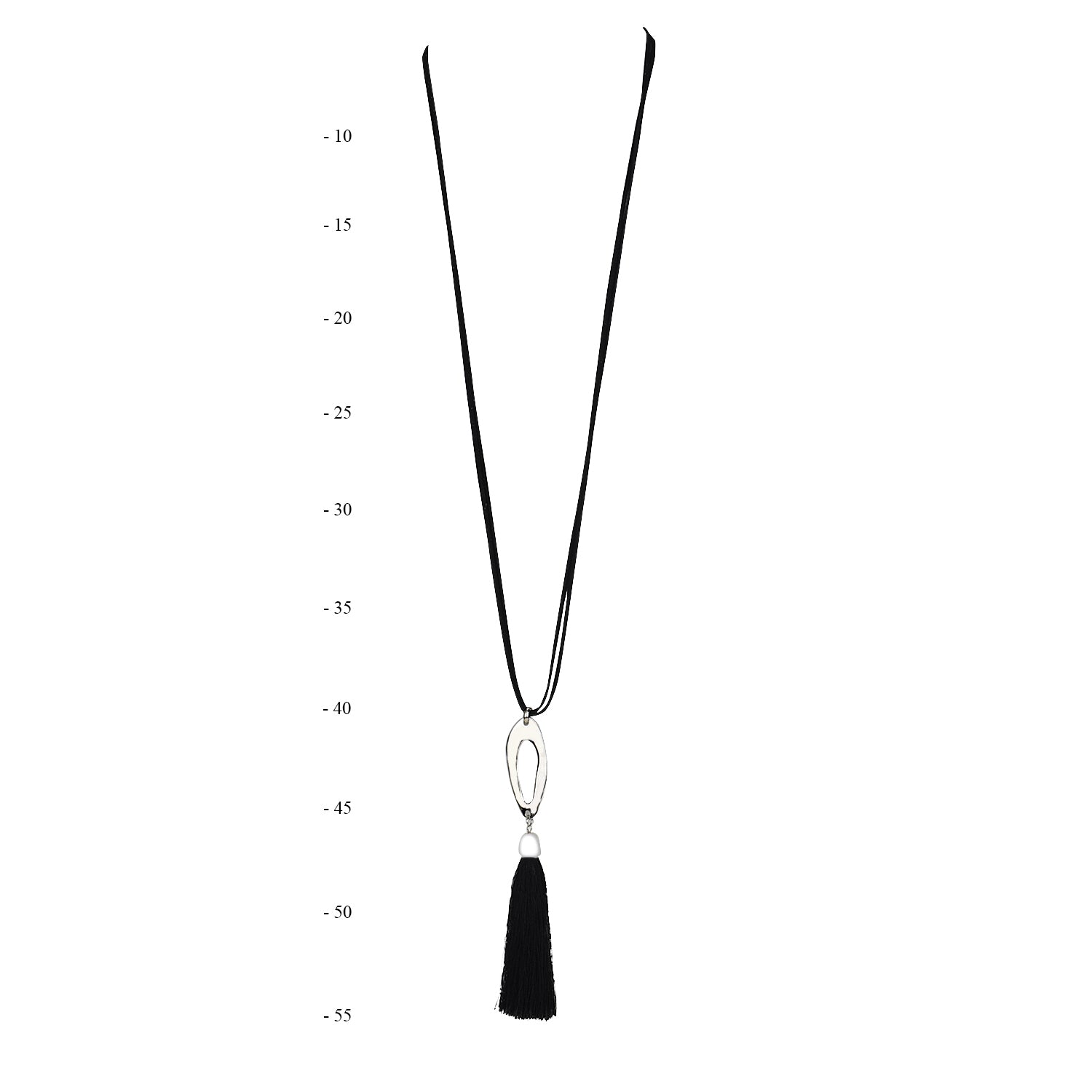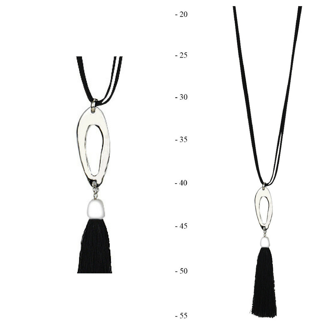 Elegant shiny Silver Oval Frame Pendant, paired with Black Suede Leather necklace. The Pendant is decorated with Shiny Silky Black tassels. This necklace is fabulous way to dress up any outfit, by adding dimension and contrast. It is also a great way to create a versatile wardrobe when you travel without adding the extra luggage weight. Necklaces make great gift item. _ RRP: $25 - $29.90. _ Pendant (Height-14.0 & Width- 2.0) _ Straight Length 57cm (Necklace & Pendant) _ Total Necklace (Length 84cm) _ Necklace Cord (Width 0.3cm)