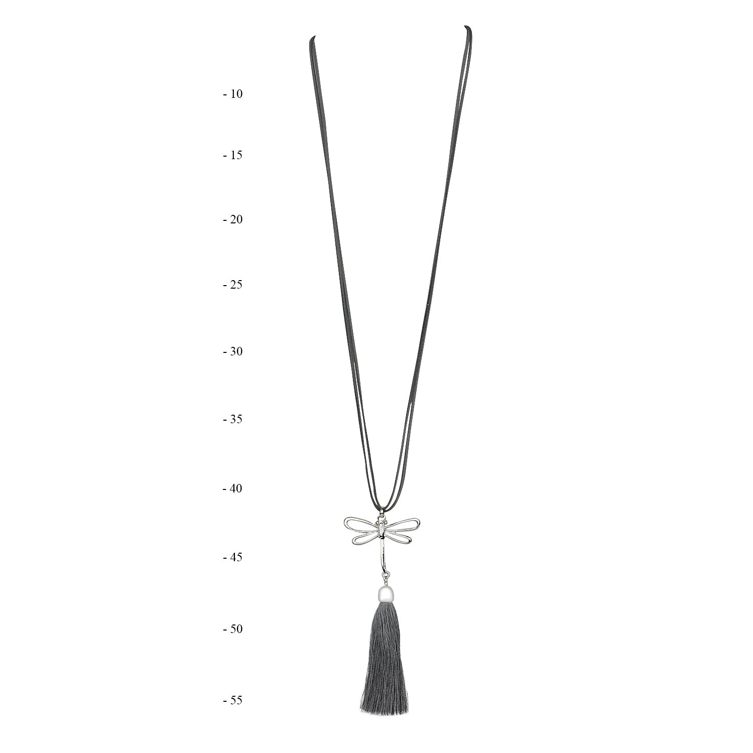 Elegant shiny Silver Dragonfly Pendant, paired with Grey Suede Leather necklace. The Pendant is decorated with Shiny Silky Grey thread tassels. This necklace is fabulous way to dress up any outfit, by adding dimension and contrast. It is also a great way to create a versatile wardrobe when you travel without adding the extra luggage weight. Necklaces make great gift item. _ RRP: $25 - $29.90. _ Pendant (Height-14.0 & Width- 6.0) _ Straight Length 58cm (Necklace & Pendant) _ Total Necklace (Length 88cm) _ Necklace Cord (Width 0.3cm)