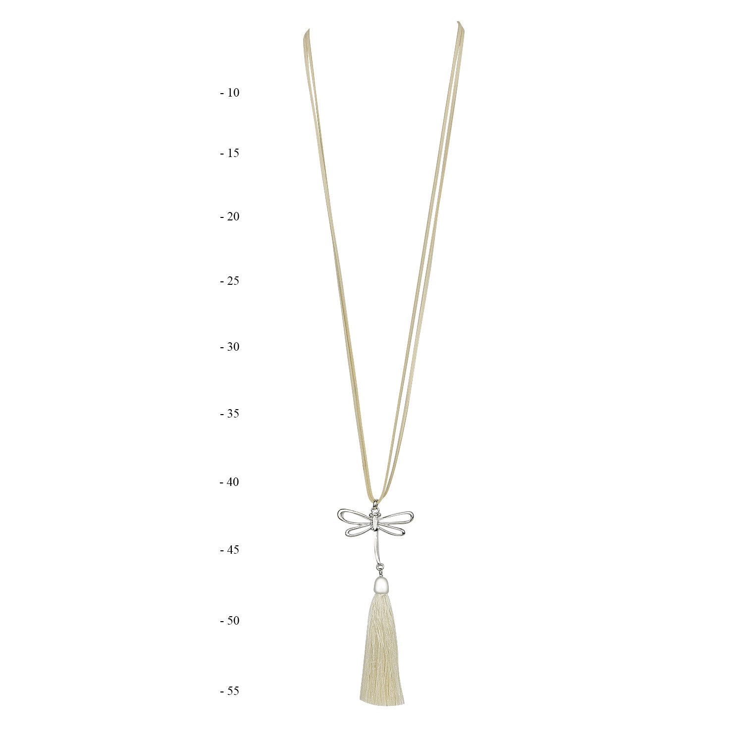 Elegant shiny Silver Dragonfly Pendant, paired with Cream Suede Leather necklace. The Pendant is decorated with Shiny Silky Cream thread tassels. This necklace is fabulous way to dress up any outfit, by adding dimension and contrast. It is also a great way to create a versatile wardrobe when you travel without adding the extra luggage weight. Necklaces make great gift item. _ RRP: $25 - $29.90. _ Pendant (Height-14.0 & Width- 6.0) _ Straight Length 58cm (Necklace & Pendant) _ Total Necklace (Length 88cm) _ Necklace Cord (Width 0.3cm)