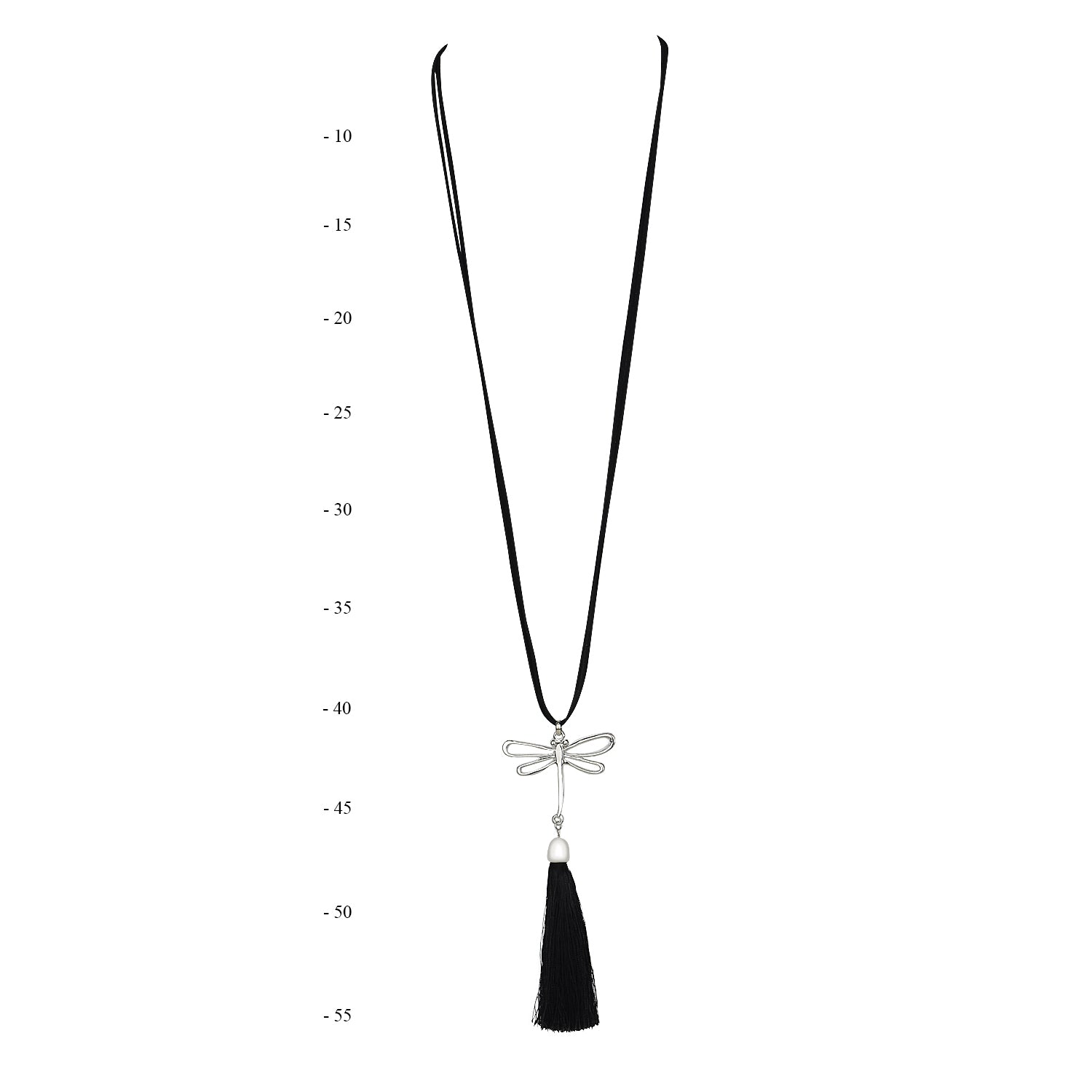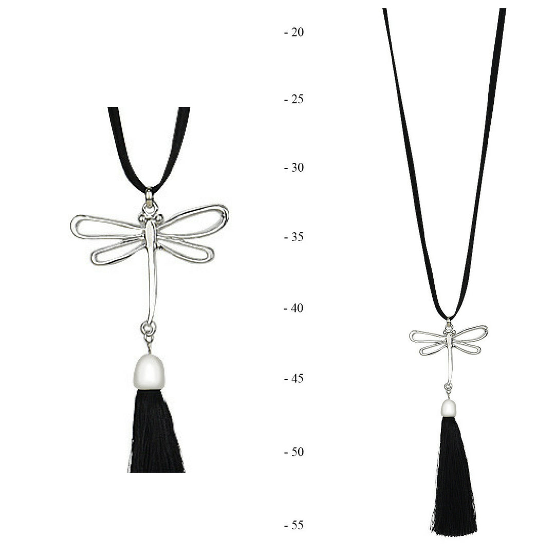 Elegant shiny Silver Dragonfly Pendant, paired with Black Suede Leather necklace. The Pendant is decorated with Shiny Silky Black thread tassels. This necklace is fabulous way to dress up any outfit, by adding dimension and contrast. It is also a great way to create a versatile wardrobe when you travel without adding the extra luggage weight. Necklaces make great gift item. _ RRP: $25 - $29.90. _ Pendant (Height-14.0 & Width- 6.0) _ Straight Length 58cm (Necklace & Pendant) _ Total Necklace (Length 88cm) _ Necklace Cord (Width 0.3cm)