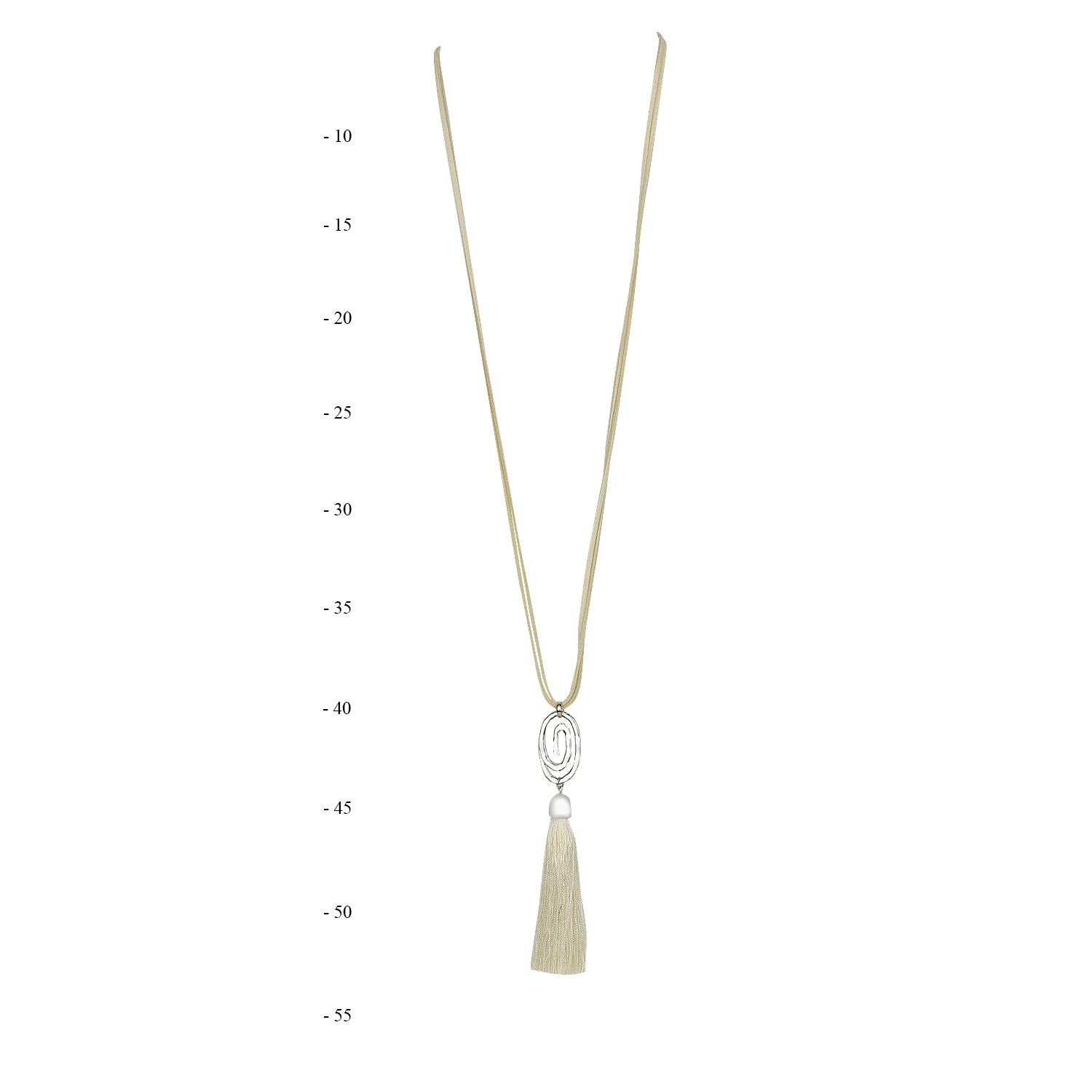 Elegant shiny Silver Circle of Life Pendant, paired with Cream Suede Leather necklace. The Pendant is decorated with Shiny Silky Cream thread tassels. This necklace is fabulous way to dress up any outfit, by adding dimension and contrast. It is also a great way to create a versatile wardrobe when you travel without adding the extra luggage weight. Necklaces make great gift item. _ RRP: $25 - $29.90. _ Pendant (Height-14.0 & Width- 2.0) _ Straight Length 57cm (Necklace & Pendant) _ Total Necklace (Length 84cm) _ Necklace Cord (Width 0.3cm)