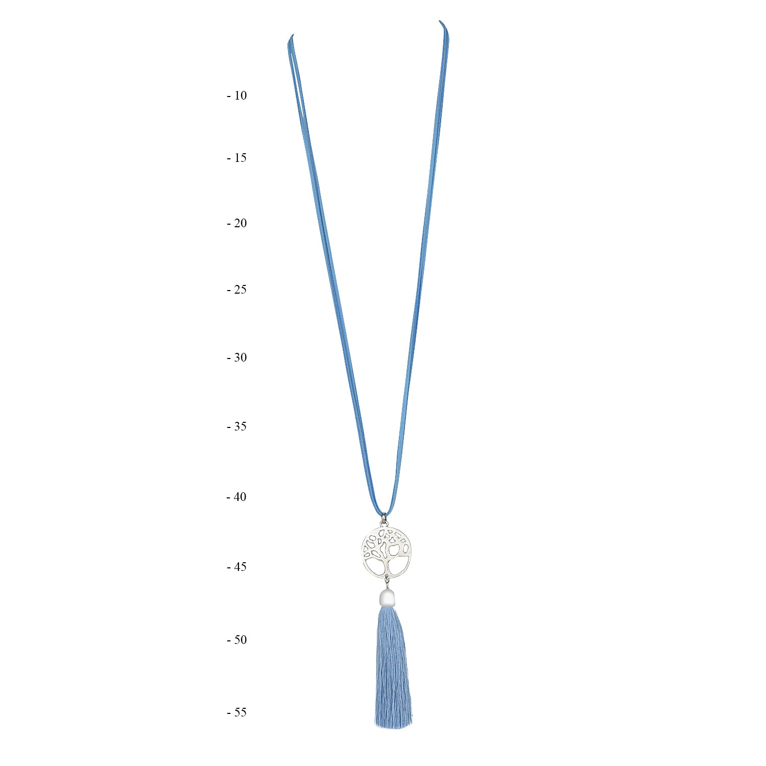 Elegant shiny Silver Tree of Life Pendant, paired with French Blue Suede Leather necklace. The Pendant is decorated with Shiny Silky French Blue tassels. This necklace is fabulous way to dress up any outfit, by adding dimension and contrast. It is also a great way to create a versatile wardrobe when you travel without adding the extra luggage weight. Necklaces make great gift item.