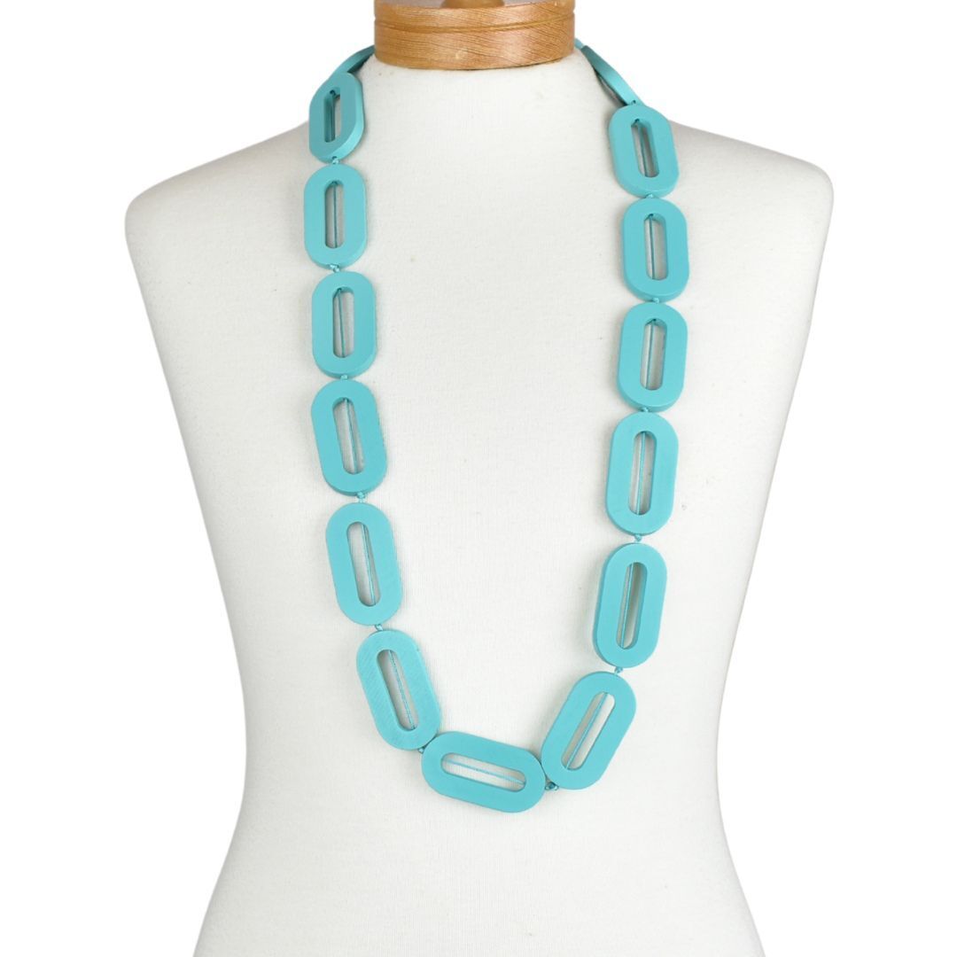 THSJ1276: Teal Green D Chunky Wooden Necklace Breathe life into your outfit with the refreshing tones of our Teal Green Chunky Wooden Necklace. Crafted from smooth wooden beads in a captivating teal hue, this statement accessory strikes the perfect balance between bold and elegant. Its clean, single-colour finish and long-bead silhouette make it ideal for layering or wearing solo as a standout piece. Lightweight and easy to wear, it offers all-day comfort with a pop of colour. A thoughtful gift for herNwhether for MotherOs Day, birthdays, a teacher thank-you, or a farewell gift that travels well by post. A stylish addition to any fashion jewellery collection. Material: Wood + Cord Measurement: Bead Size - 3cm Wide x 5.5cm High - 90 length - circumference