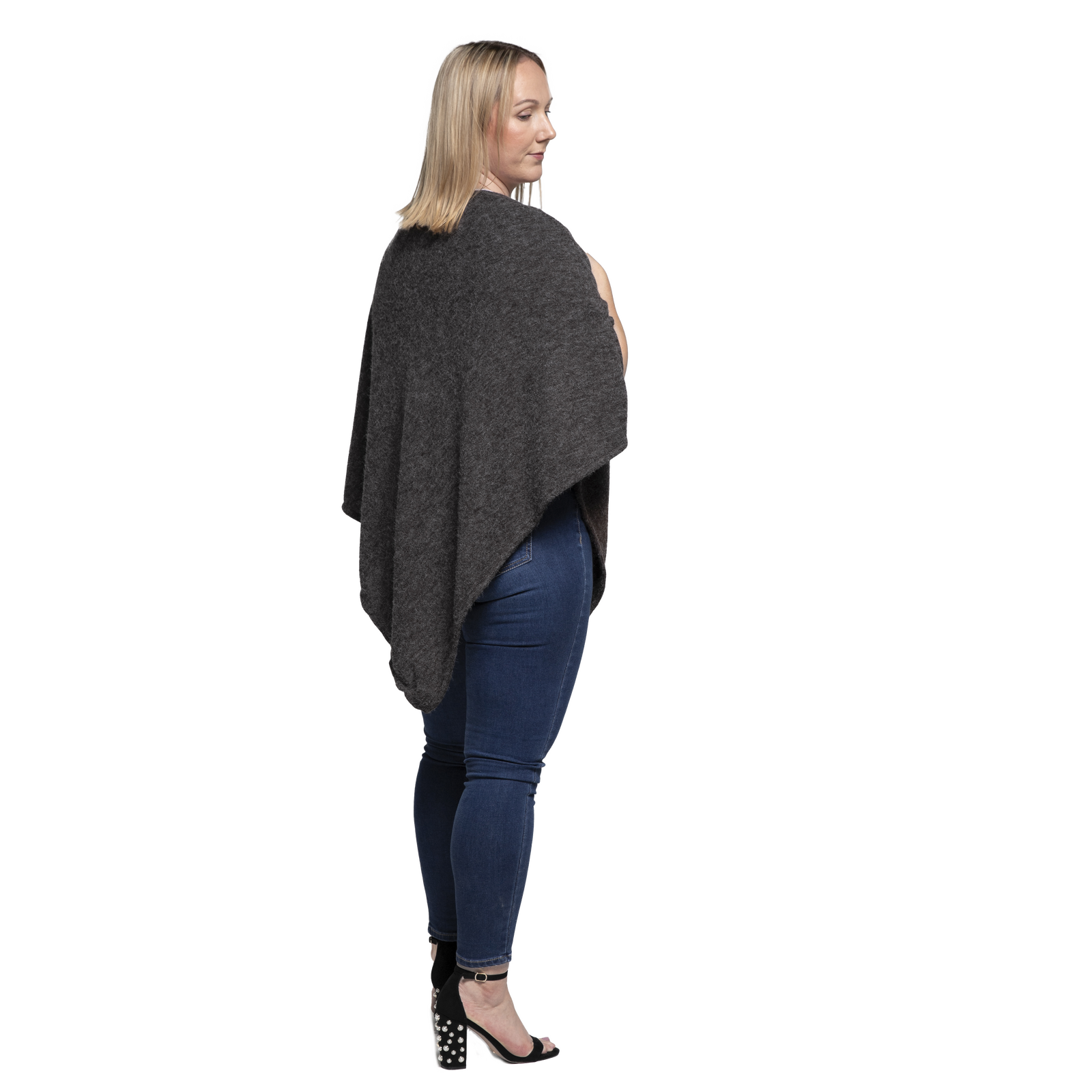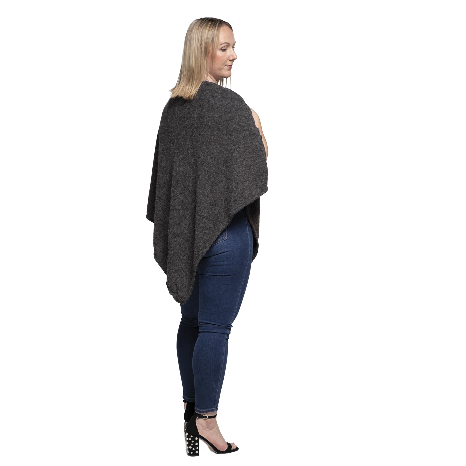 This Elegant, practical and versatility Charcoal Black colour with white yarn knitted in, is a Wool and Acrylic Blend Poncho with V Shape poncho is a must have in every wardrobe for any season. This one size fits poncho most is perfect as a gift or just one for yourself. A slid on the right or left hand for ease to work.