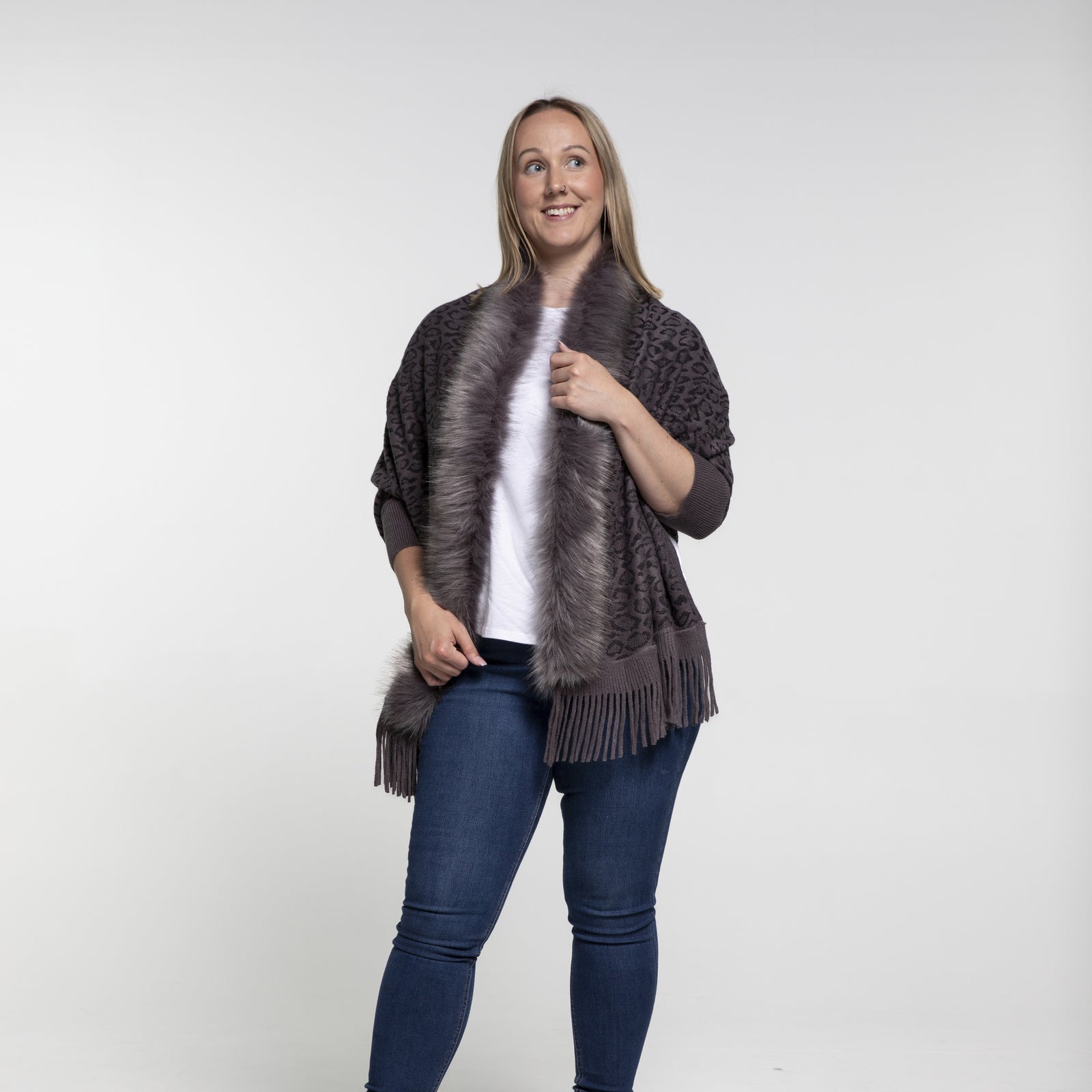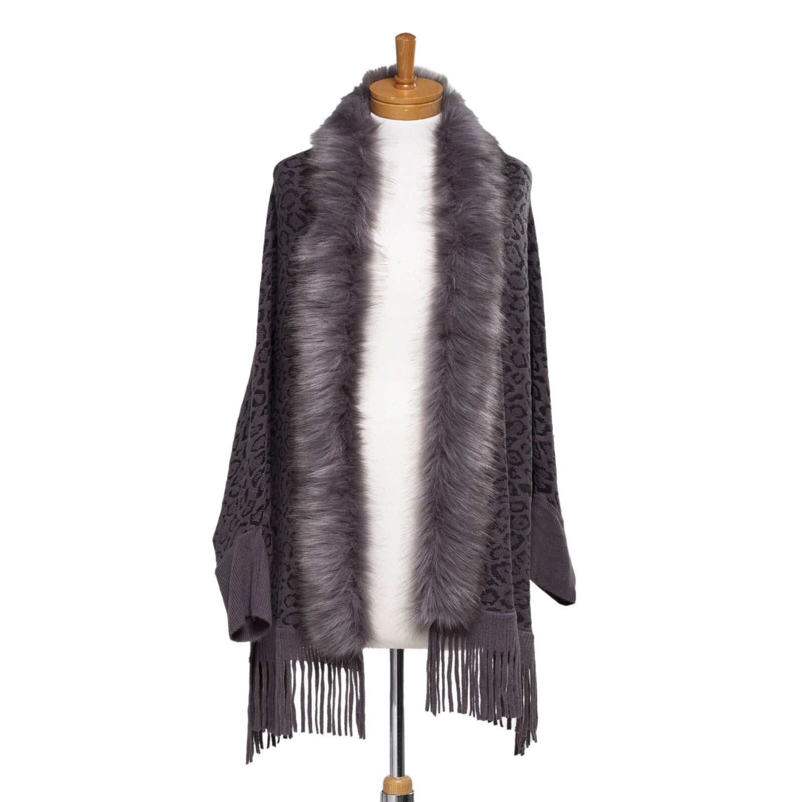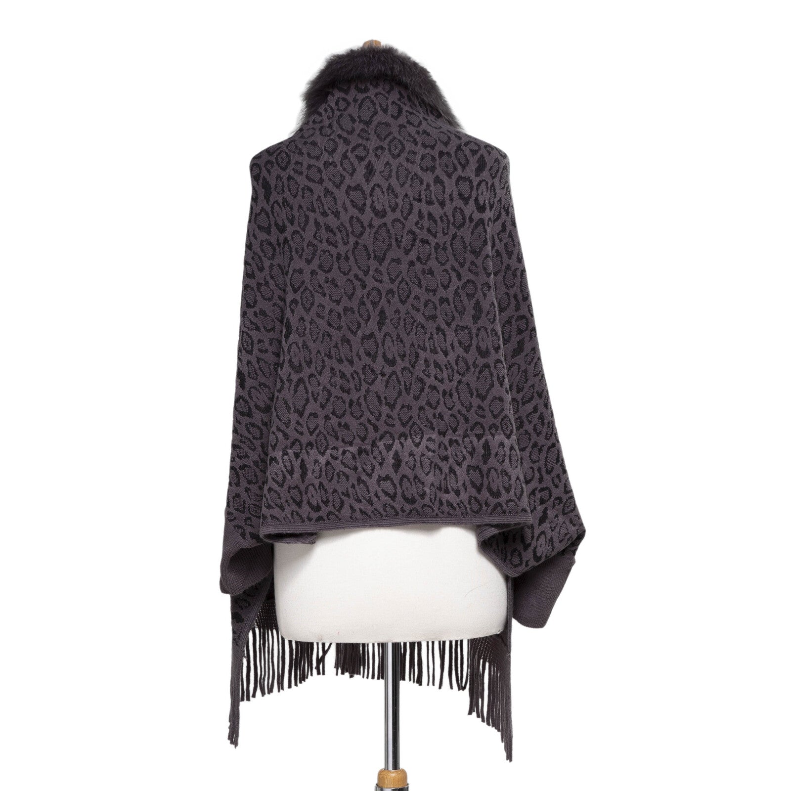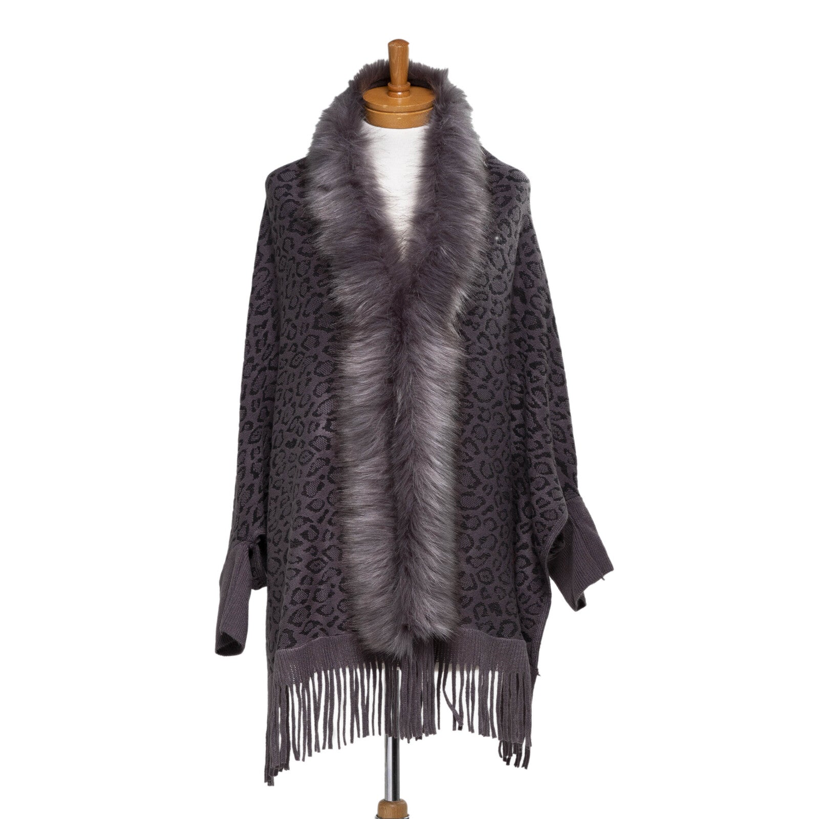 Indulge in glamour with our Faux Fur Leopard Sleeve Cape Wrap in chic Grey, accentuated by Grey and Black hues. Crafted from 100% Acrylic, this 180 x 40cm sleeve area and 70 x 100cm back accessory features luxurious faux fur in Grey, has cuff sleeves, a secure buckle, and trendy fringe detailing. The captivating animal print showcases a stylish monogram of black leopard prints on a grey coloured background. Ideal for the modern woman, this soft and sophisticated cape wrap adds a touch of wild elegance to your ensemble. Embrace the allure of one size fits most faux fur with this statement piece.