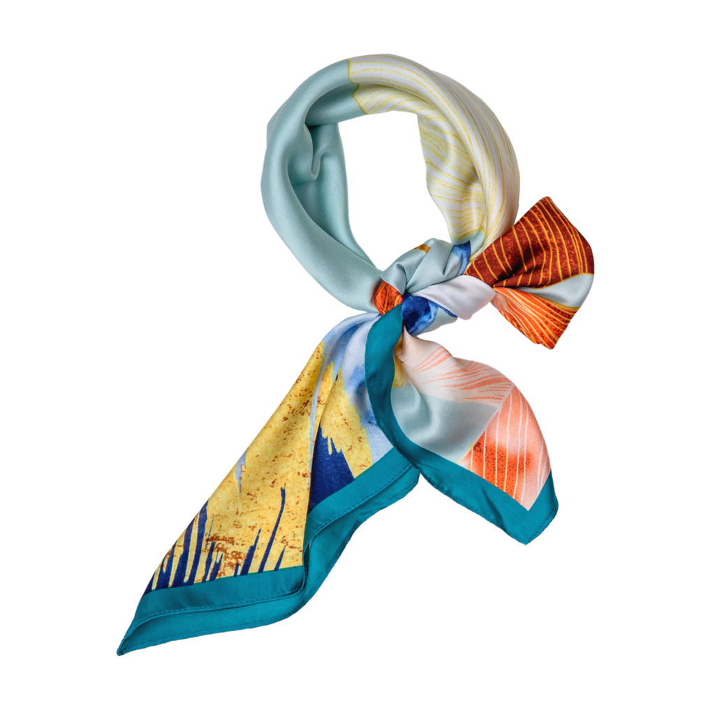 Beautiful soft multi coloured mustard yellow blue tone square scarf with gingko leaf and floral print design with teal green border will surely brighten any outfit. This light weight summer scarf is classy and elegant, the soft texture of the scarf feel ever so soft againts the neck. A must have scarf in any wardrobe.