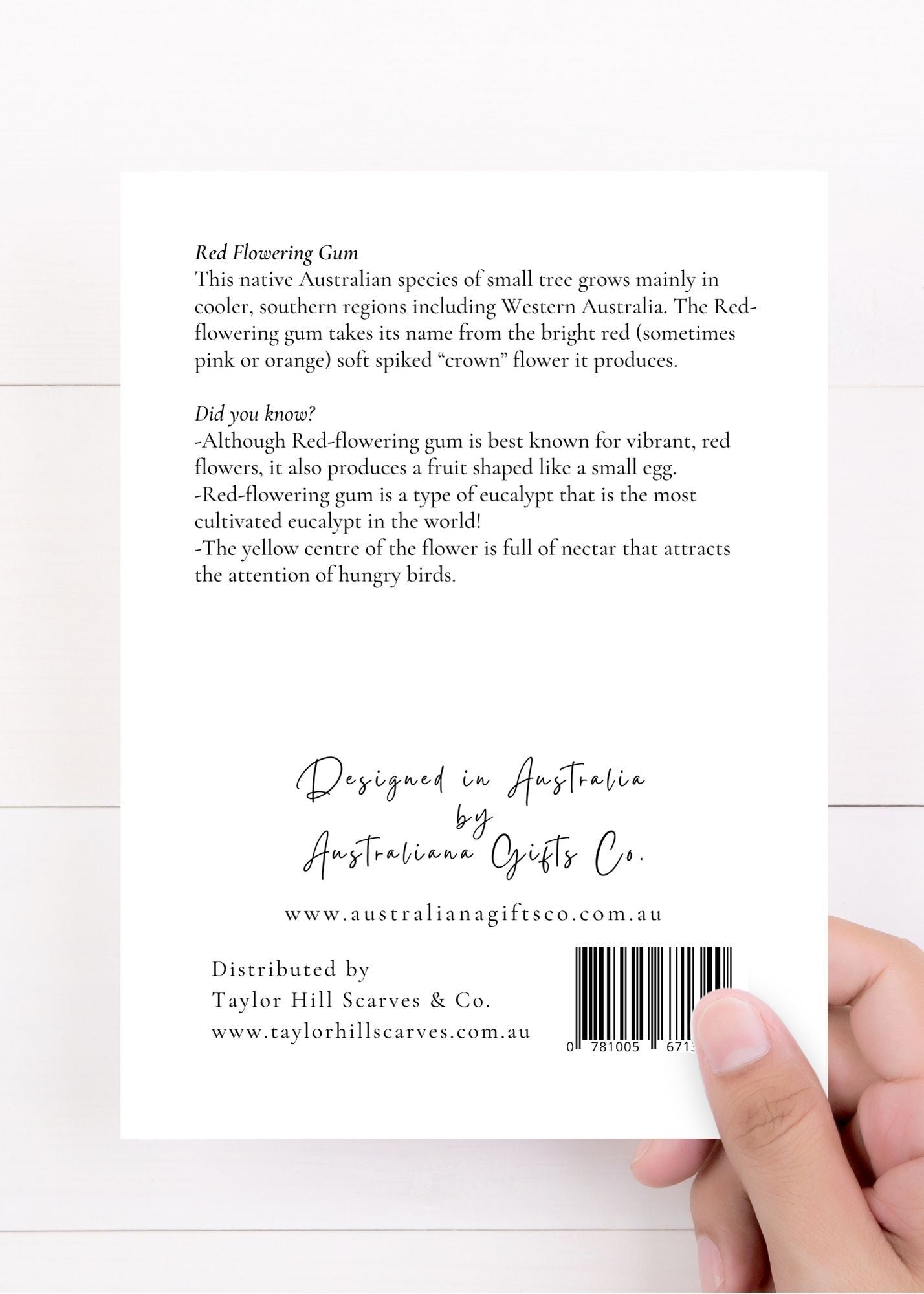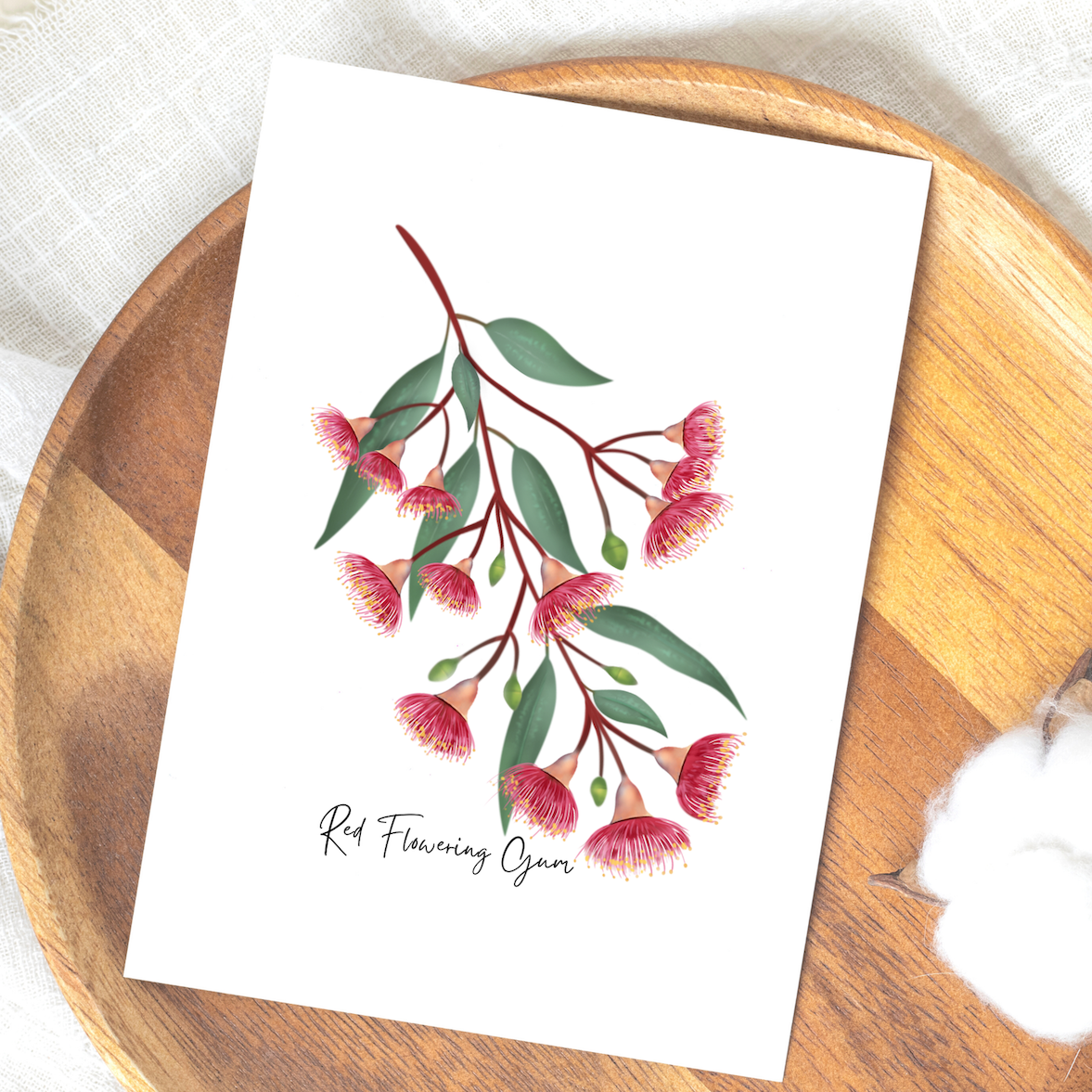 Inspired by the striking beauty of this native blossom, this card captures the essence of the Australian bush in full bloom. Known for its bright red flowers and symbolic resilience, the Red Flowering Gum adds a burst of colour and charm to any message.