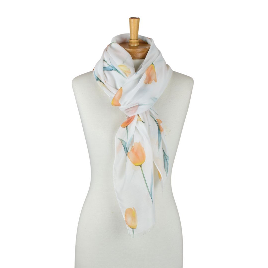 THSS2795: Orange D Blooming Tulips Scarf Brighten your wardrobe with the joyful tones of our Blooming Tulips Scarf in Orange. Inspired by blooming spring tulips, this vibrant design captures the essence of seasonal warmth and renewal. Made from a lightweight blend of viscose and cotton, it drapes softly and feels breathableNideal for layering throughout the year. Featuring cheerful tones of tangerine, coral, and fresh green, it brings effortless charm to both casual and dressy looks. Style it as a neck scarf, wrap, or hair accessory. It also makes a heartfelt gift for herNperfect for MotherOs Day, birthdays, teacher thank-yous, or sending overseas as a lightweight Australian souvenir. Material: 70% Viscose 30% Cotton Measurement: 180 x 70cm Colour: Orange